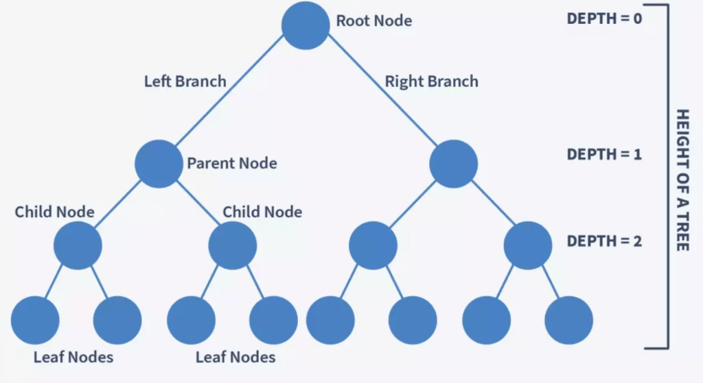 Depth of a Binary Tree – The number of edges from a node in the tree to the root node.
